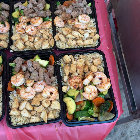 Mini Trios brings chef-cooked hibachi to your event in a fast, streamlined service format designed for larger gatherings. Guests are served small plates with everything being cooked on-site and served efficiently, so everyone can enjoy great food without slowing down the energy of the event.